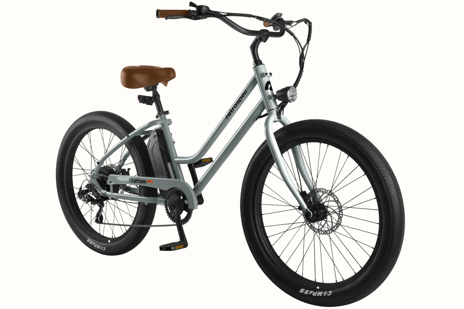 The Chatham Rev 2 and its step-through model are the most popular Retrospec beach cruiser e-bikes. These designs are all about comfort so riders can enjoy hours of fun on two wheels. Both frame styles feature no-slip grips and pedals, a plush saddle, sweptback handlebars, and a geometry that promotes an upright riding position.
